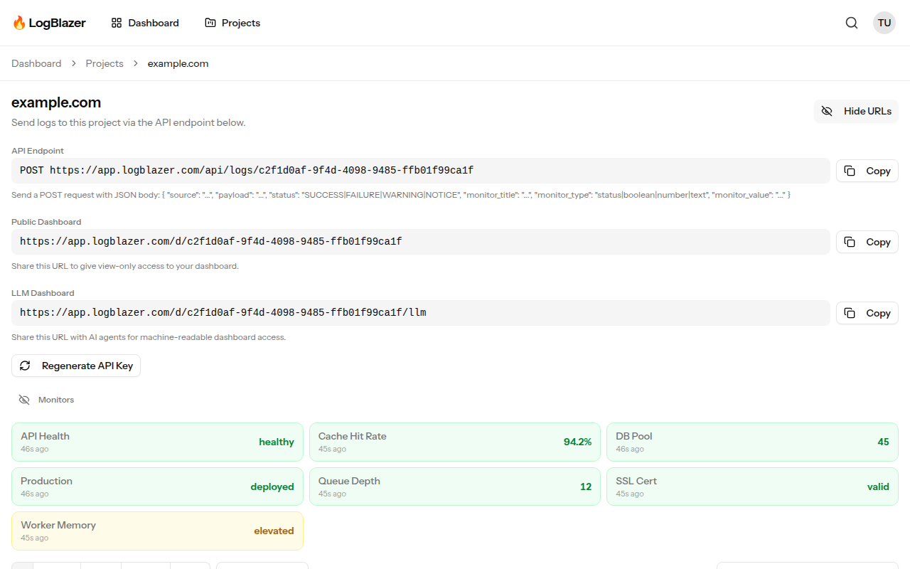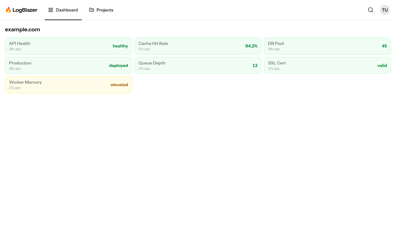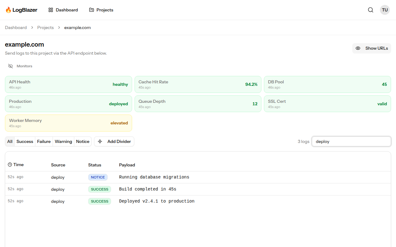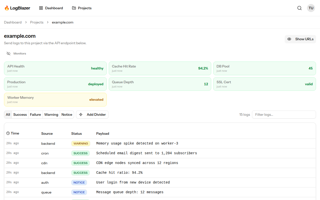 LogBlazer is a simple but powerful logging dashboard. Send logs from any language, organize them by source and status level, create monitor cards for at-a-glance health checks, and share public dashboards with your team — all without the complexity of traditional observability platforms.