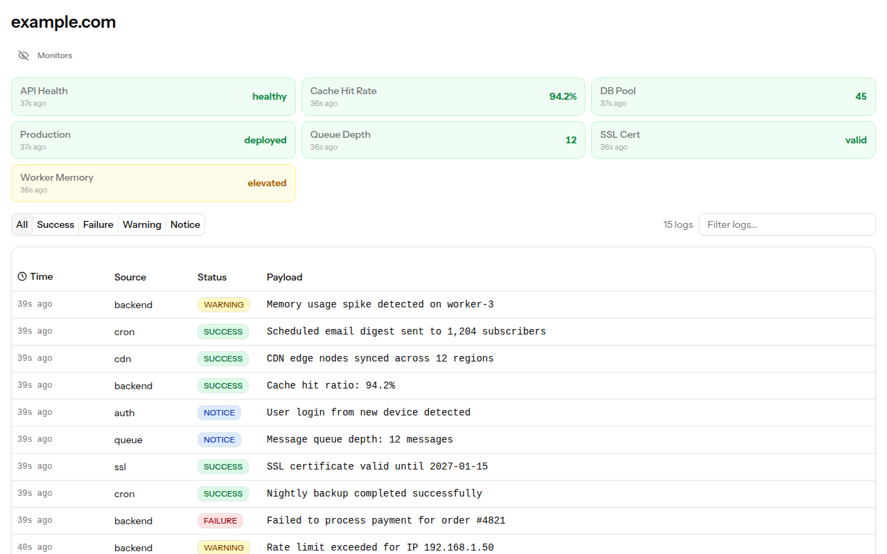 Logs flow into your dashboard in real time, organized by source. Each entry is color-coded by status level — SUCCESS, FAILURE, WARNING, and NOTICE — so you can spot problems at a glance. Monitor cards sit at the top of the page, giving you a live overview of the metrics that matter most.